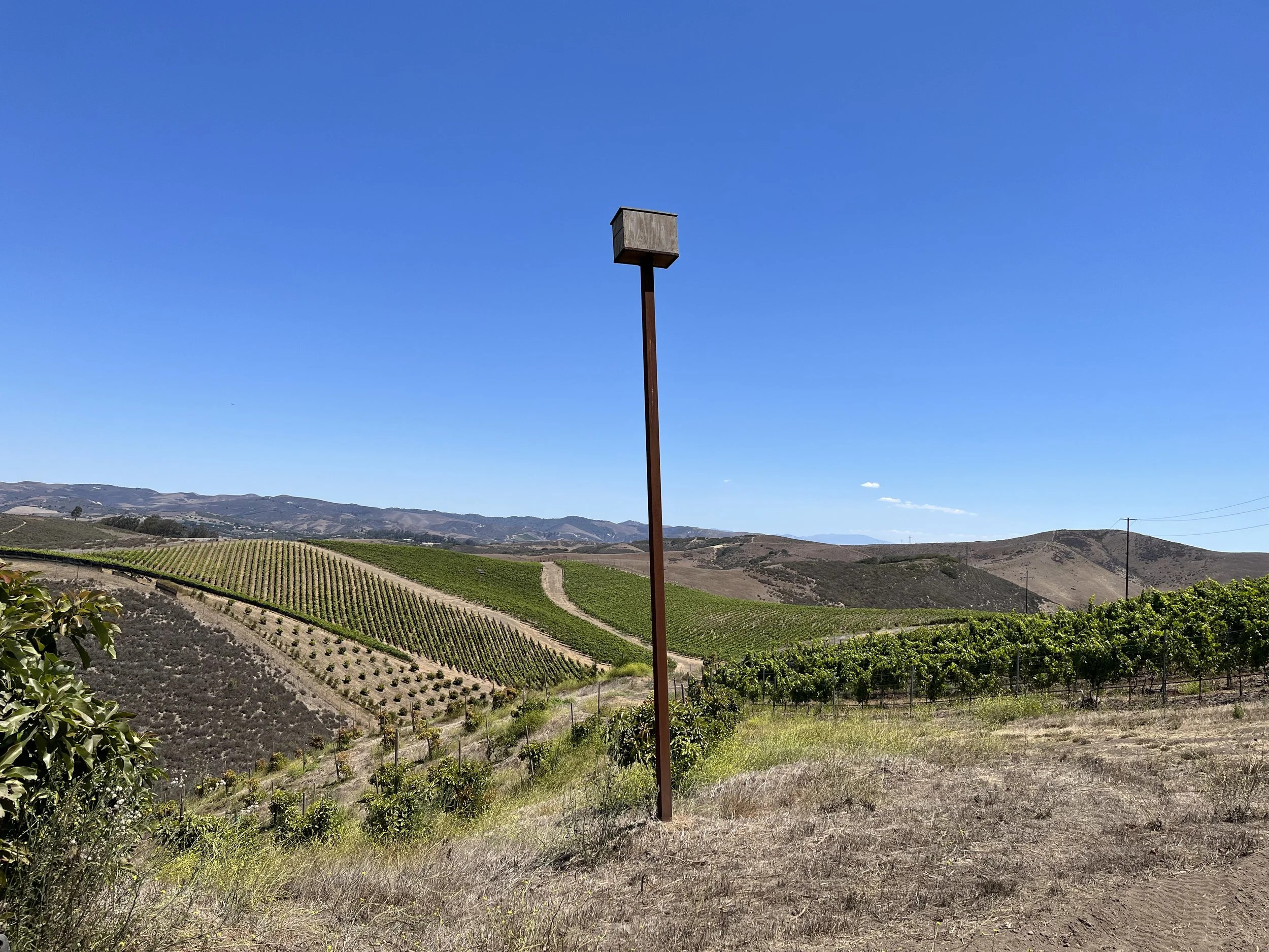 Gophers are a constant pest in these sandy soils, and our 18 owl boxes are currently at full occupancy! It gives us great pleasure to see piles of bones beneath the boxes, envisioning a well-fed owl family and fewer gophers feeding on our vines’ roots.