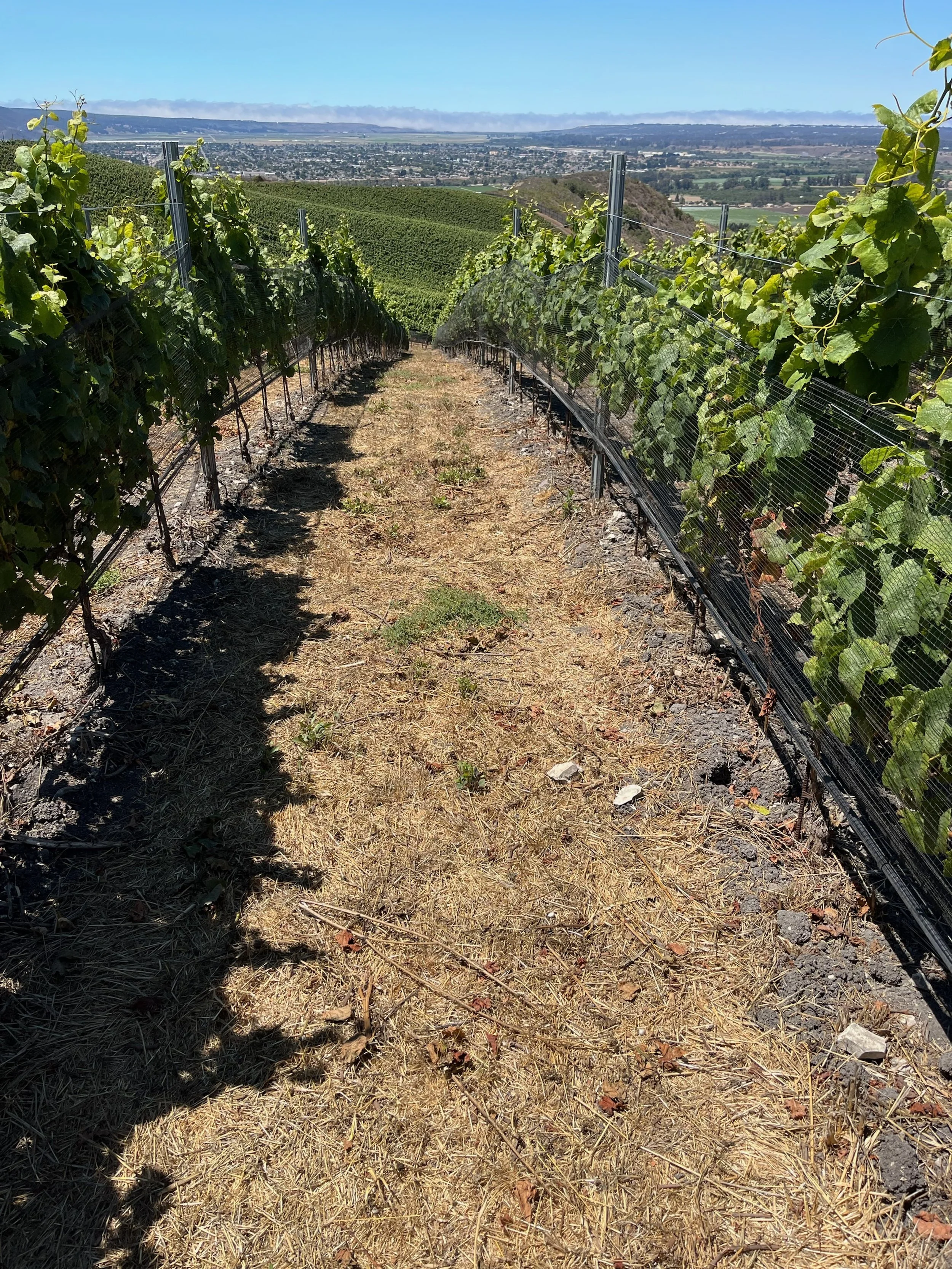 A soil-building legume-based cover crop is planted each year to encourage nitrogen fixation, increase the water holding capacity of the soils, and decrease erosion of our wind-swept soils. We have moved to a No Till practice, meaning we have left a permanent cover crop throughout the vineyard, to further decrease soil erosion. We will continually monitor if this is an effective measure. For example, we could decrease the erosion and dust throughout the property but at the same time create a greater need for fertilizer and water inputs due to the competition of the cover crop and the vines. We will continue to evaluate and alter our practices to the most sustainable choice for our property.